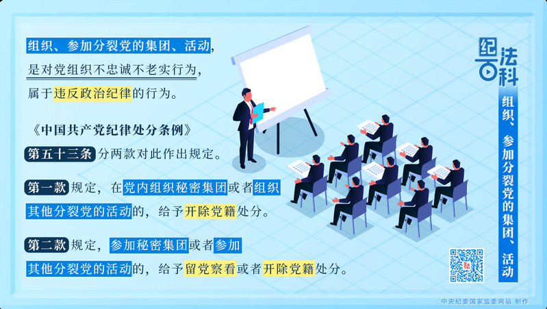 《中国共产党纪律处分条例》第五十三条分两款对此作出规定。第一款规定,在党内组织秘密集团或者组织其他分裂党的活动的,给予开除党籍处分。第二款规定,参加秘密集团或者参加其他分裂党的活动的,给予留党察看或者开除党籍处分。