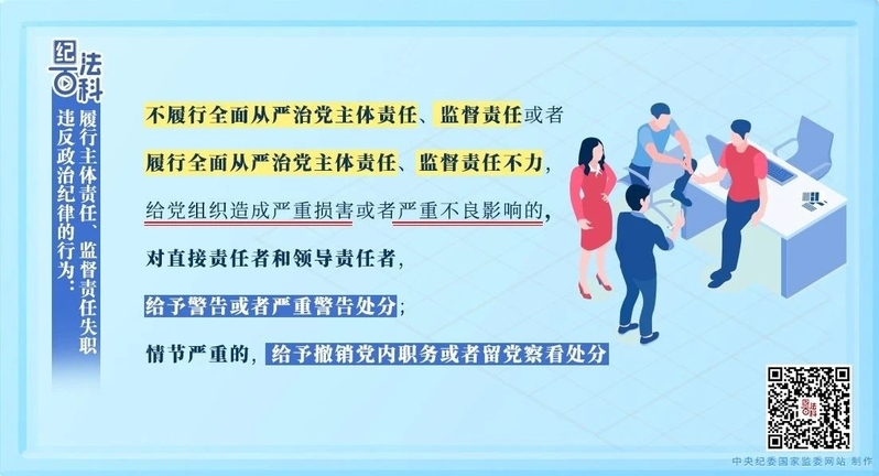 《中国共产党纪律处分条例》第七十四条规定:不履行全面从严治党主体责任、监督责任或者履行全面从严治党主体责任、监督责任不力,给党组织造成严重损害或者严重不良影响的,对直接责任者和领导责任者,给予警告或者严重警告处分;情节严重的,给予撤销党内职务或者留党察看处分。