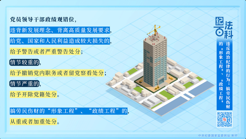《中国共产党纪律处分条例》第五十七条规定:党员领导干部政绩观错位,违背新发展理念、背离高质量发展要求,给党、国家和人民利益造成较大损失的,给予警告或者严重警告处分;情节较重的,给予撤销党内职务或者留党察看处分;情节严重的,给予开除党籍处分。搞劳民伤财的“形象工程”、“政绩工程”的,从重或者加重处分。