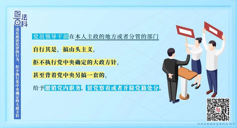 《关于新形势下党内政治生活的若干准则》规定,“对党中央决策部署,任何党组织和任何党员都不准合意的执行、不合意的不执行,不准先斩后奏,更不准口是心非、阳奉阴违。”“决不允许自行其是、各自为政,决不允许有令不行、有禁不止,决不允许搞上有政策、下有对策。”(引自:山东省纪委监委网站)
