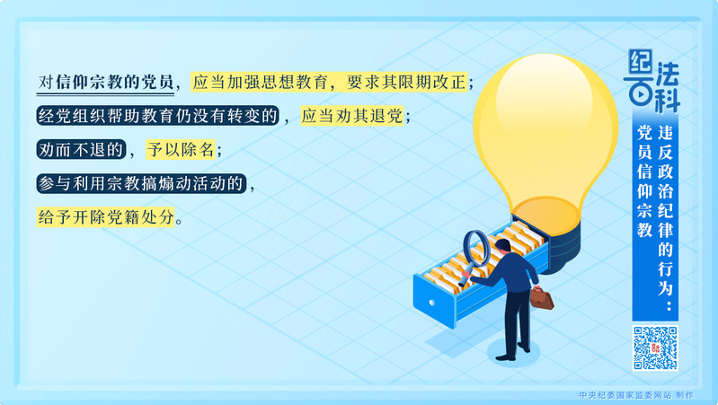 《中国共产党纪律处分条例》第六十九条规定,对信仰宗教的党员,应当加强思想教育,要求其限期改正;经党组织帮助教育仍没有转变的,应当劝其退党;劝而不退的,予以除名;参与利用宗教搞煽动活动的,给予开除党籍处分。