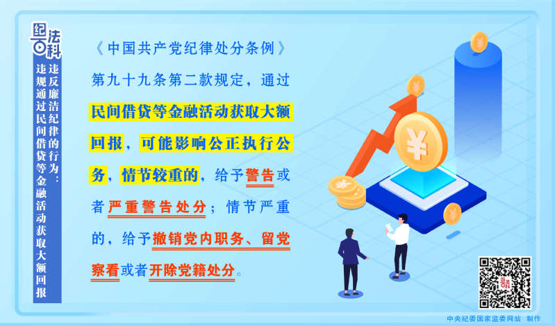 《中国共产党纪律处分条例》第九十九条第二款规定,通过民间借贷等金融活动获取大额回报,可能影响公正执行公务,情节较重的,给予警告或者严重警告处分;情节严重的,给予撤销党内职务、留党察看或者开除党籍处分。