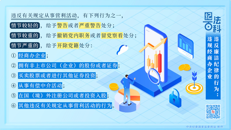 《中国共产党纪律处分条例》第一百零三条第一款第一项、第二项、第五项规定,违反有关规定经商办企业,拥有非上市公司(企业)的股份或者证券,在国(境)外注册公司或者投资入股的,给予相应处分。