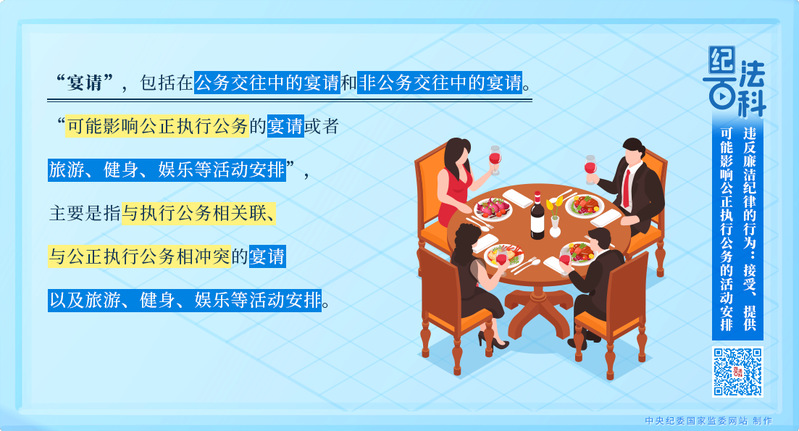 “宴请”,包括在公务交往中的宴请和非公务交往中的宴请。“可能影响公正执行公务的宴请或者旅游、健身、娱乐等活动安排”,主要是指与执行公务相关联、与公正执行公务相冲突的宴请以及旅游、健身、娱乐等活动安排。接受这些活动安排,就有可能影响公正执行公务。这种“可能”,不以接受安排者的主观意愿为依据,而应由党组织根据客观情况分析判断。比如,下级有求于上级时对上级的宴请,接受私营企业主、下属等管理和服务对象的宴请,工作对象对有关部门人员提供的旅游,受监督管理的一方对实施监督管理的一方提供的健身活动,下级单位为了获取政治、经济利益对上级领导部门工作人员提供的娱乐等活动,无论是什么标准,无论花费的是否是公款,只要是可能影响公正执行公务的活动安排,就一概不能接受。