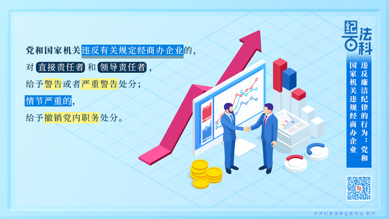 《中国共产党纪律处分条例》第一百零八条规定,党和国家机关违反有关规定经商办企业的,对直接责任者和领导责任者,给予警告或者严重警告处分;情节严重的,给予撤销党内职务处分。